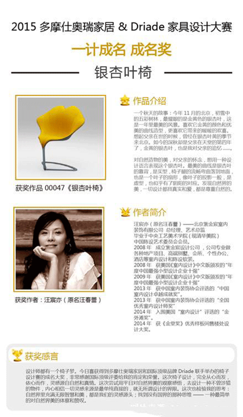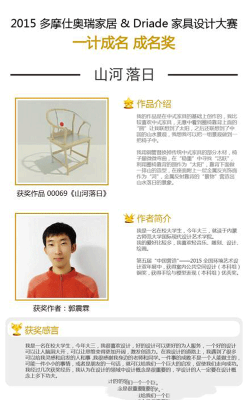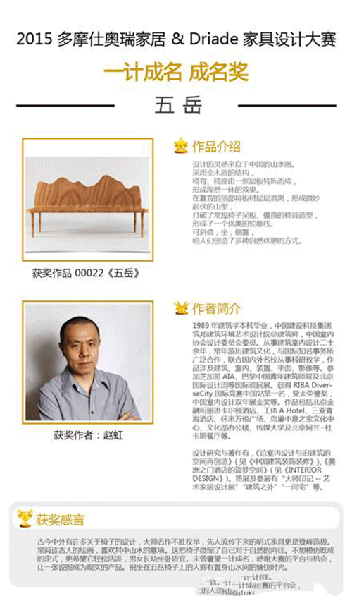 2015年12月中旬,備受中國和歐洲家居及設(shè)計(jì)行業(yè)所矚目的“一計(jì)成名”設(shè)計(jì)大賽大獎揭曉。此次大賽由多摩仕奧瑞家居與Driade聯(lián)合舉辦,歷經(jīng)數(shù)月受到社會各界的廣泛關(guān)注,活動收到來自世界各地眾多華人設(shè)計(jì)師的投稿作品。經(jīng)過專業(yè)評委的嚴(yán)格評選,海選出一百余件入圍作品,并最終誕生了“全場大獎”— 《記憶》 和 5位“成名獎”—《五岳》 《方圓》 《銀杏葉椅》 《叁.竹木椅》 《山河落日》。