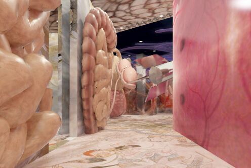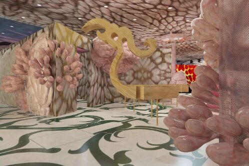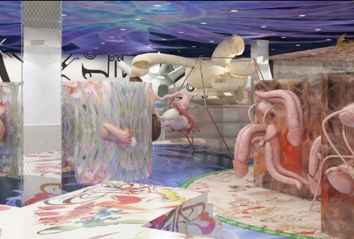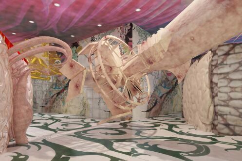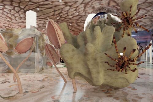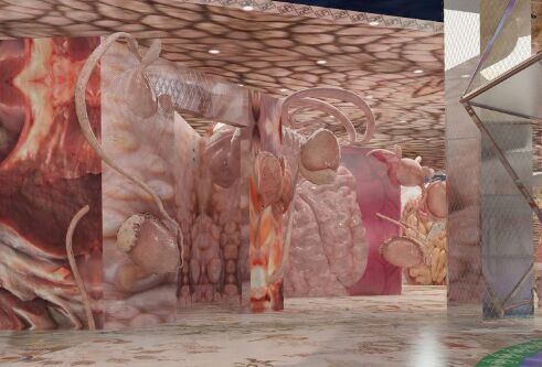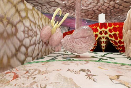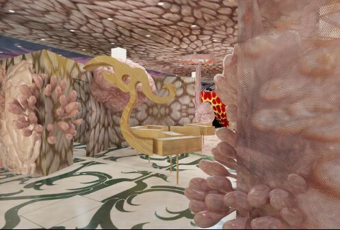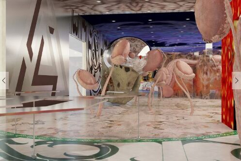 在《鮟鱇》中,他將空間藝術提升到前所未有的高度,通過發明概念等手法,賦予空間全新的表現力和復雜性。他善于用豐富而充滿悖論的語言構筑繁復的空間,繁復到極致。他的作品常常以人類人性碰撞的場面,觸碰到諸多歷史和文化的盲點。他的藝術是讓人對人性與自由二種極端體驗達到極限,然后得到精神上的凈化。他的空間時空錯落,結構扭曲,幻象層出不窮。根植于人類潛意識的深處,空間凝結了難以啟齒的辛澀與羞恥,這個空間可以感知,卻無從捕捉。密集的器官,空洞的太空裝置與生物,腥紅的表皮,這里時空錯落扭曲,幻象層出不窮,處處流淌著材料與感官刺激、怪誕、隱喻與夢魘、神秘、華麗、眩暈、富麗堂皇、驕奢靡逸、匪夷所思……這里是單純與繁復的迷宮,詭異與爆裂的花園,意識與神話的源泉,充滿了數學的精準和音樂的迷狂錯亂,無邊柔軟的欲望之體不忍觸碰.令人窒息。淪陷在這個幽深錯亂的華麗之夢里,喚起潛意識里的對于人類空洞的征服文明的恐懼,它們是這個世界真實的表達——個體的無助和欲求。