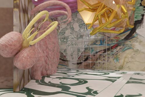 物質生命在其內核中聚集著最大的敏感性和張力,物質中吸收著人類的意識與欲望,空間在身體器官的肉,黏膜,器官,軟的身體感覺,與海洋中色彩絢麗的海洋奇異生物,“感覺得以在物質中實現的過程就同時時物質整體性地深入和轉化為感覺的過程,即轉化為感知和感情的過程。空間具有一種留存的作用,即它有一種“持久性”,空間的“留存”又不等同于物質自身的持久性,因為空間正是感覺的結合體,時感知于感情的聚合體。留存的正是“感覺”,正是作為“感知”和“感情”的“感覺”的復合體。