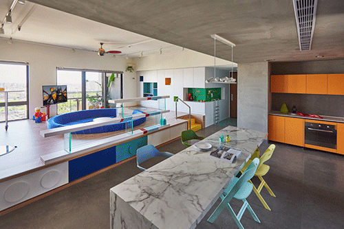 俏皮感十足的生活空間圍繞一個下沉式的“游戲池”展開