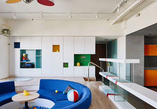 HAO設計工作室利用各種巨型樂高玩具般的體塊改造了臺灣高雄市一棟公寓的室內空間。這處俏皮感十足的生活空間圍繞一個“游戲池”展開,為宅中的年輕家庭提供了一個共享的娛樂空間。