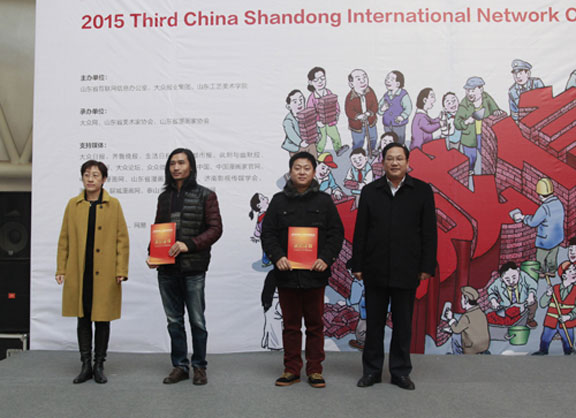 12月2日,“漫話信譽”第三屆中國·山東國際網絡漫畫大賽作品展在山東工藝美術學院長清校區美術館開幕。山東工藝美術學院副院長苗登宇主持開幕式。山東工藝美術學院副院長李新和山東省互聯網信息辦公室常務副主任李宗國,山東省漫畫家協會主席陳黎青,山東省互聯網信息辦公室新聞宣傳處處長國慶東,大眾網總編輯朱德泉,諷刺與幽默報編輯朱丞和山東省漫畫家協會副主席張梁出席開幕式。