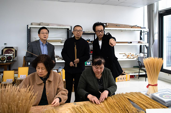 潘魯生在泊里鎮文化站參觀了麥草畫藝術博物館,實地調研了麥草畫加工藝術全流程。潘魯生認為,泊里麥草畫在發揮手藝傳承人的帶動作用,與民間藝人和當地群眾抱團發展,帶動農村婦女居家就業、增收致富方面起到了重要作用。他希望,能夠進一步加強設計創新,提升產品的創作水平,做好手工藝知識產權保護工作,做好傳統工藝的傳承和創新。