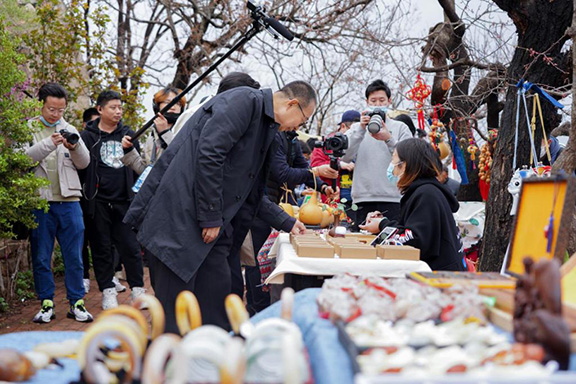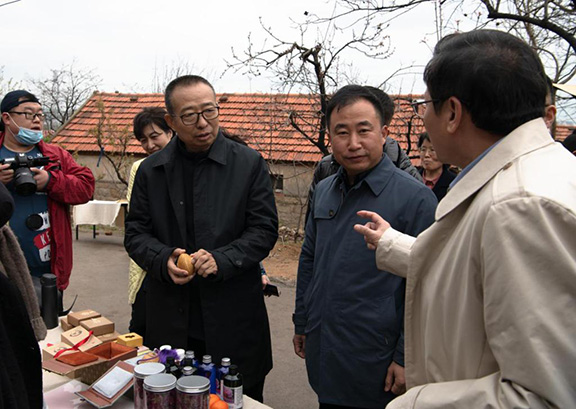 潘魯生在靈山衛街道調研鄉村文化旅游和文創市集,與參加鄉村美學主題分享會的文化愛好者進行交流。調研過程中,正逢當地村鄉村文化創意“杏運市集”開集,潘魯生對在一個小山村里看到鄉土氣息與時尚藝術元素完美融合的鄉村文創市集表示贊賞。潘魯生指出,發展鄉村旅游,不只是打造旅游景點,而是在保護和建設好鄉村自然與文化生態的基礎上,活化鄉村文化資源,凸顯鄉村特色和吸引力,為高速發展的現代化城市保留一處“鄉愁”,讓更多的人感受鄉愁的深度和鄉土的溫度。