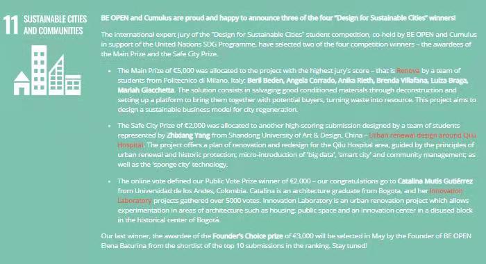 近日,由BE OPEN基金會和國際藝術、設計與媒體院校聯盟(CUMULUS)聯合主辦的“可持續城市設計”國際大賽評選結果揭曉,山東工藝美術學院建筑與景觀設計學院城鄉規劃專業2015級楊智翔同學榮獲“安全城市獎(The Safe City Prize)”大獎并獲得2000歐元獎金。
