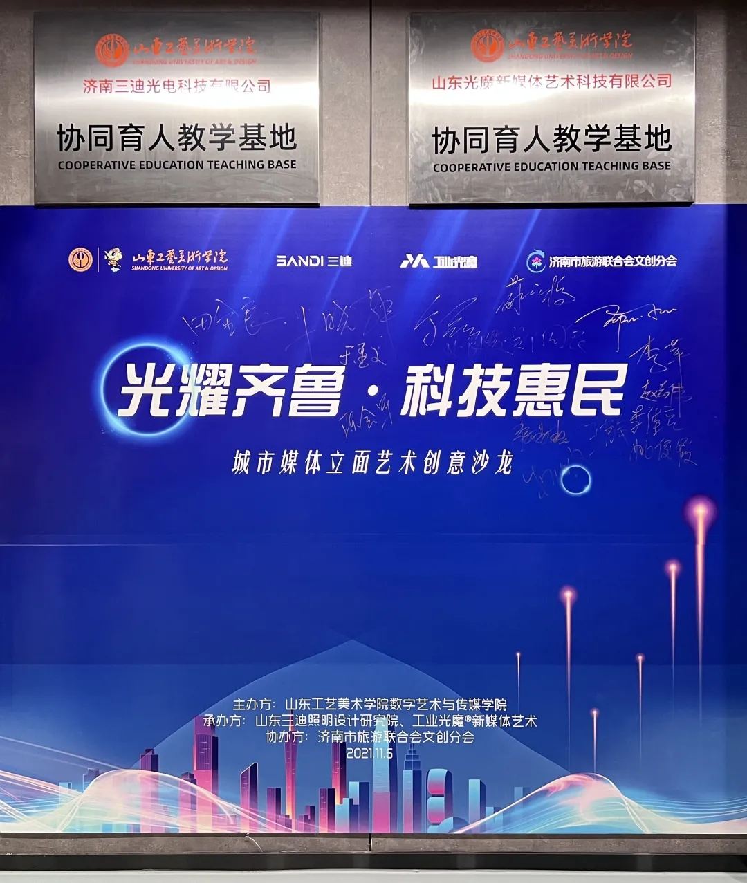 2021年11月6日,由山東工藝美術學院數字藝術與傳媒學院主辦,山東三迪照明設計研究院和工業光魔新媒體藝術聯合承辦,濟南市旅游聯合會協辦的以“光耀齊魯·科技惠民”為主題的城市媒體立面藝術創意沙龍在濟南舉行。