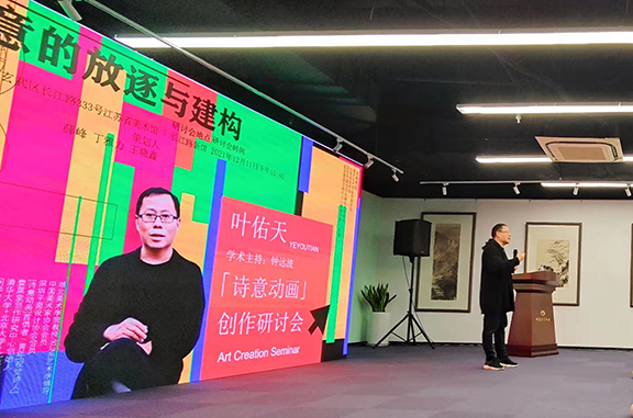 12月11日下午,葉佑天「詩意動畫」新片發(fā)布會暨創(chuàng)作研討會在江蘇省美術(shù)館召開,因受疫情影響活動采取「線上連線+線下」方式同步進行,其時近300名學界重磅專家及南京藝術(shù)學院師生濟濟一堂,共同觀摩了葉佑天四年來創(chuàng)作的六部「詩意動畫」動畫作品。同時,葉佑天教授作了《詩意的放逐與建構(gòu):詩意動畫的體系構(gòu)建、框架、特征、運行與學術(shù)話語》學術(shù)演講,闡述了自己的創(chuàng)作理念及動畫作為中國傳統(tǒng)美學的現(xiàn)代化藝術(shù)表達之路徑等。發(fā)布會由南京藝術(shù)學院薛峰教授線下主持,研討會由中國動畫學年會創(chuàng)始人鐘遠波教授線上主持,線上線下氣氛簡樸熱烈,全程散發(fā)出濃濃的學術(shù)氛圍。