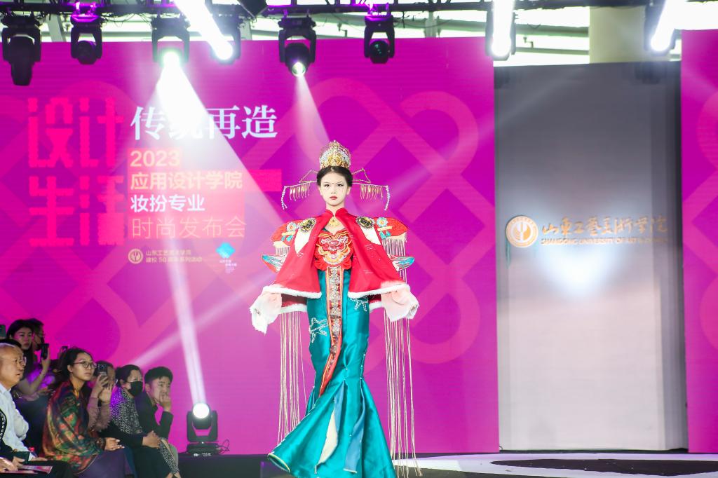 時尚發布會是山東工藝美術學院2023屆藝術博覽會動態展的部分,由山東工藝美術學院研究生處、服裝學院、現代手工藝術學院、應用設計學院共同打造,包括服裝設計展演(70套)、首飾設計展演(58套)、妝扮設計展演(16套)三個部分。這是一場傳統與時尚碰撞的藝術盛宴,也是一次守正與創新交融的匠心手造之旅。年輕的設計師們在一針一線、一絲一縷中探索未來,闡述時尚文化的潮流更迭,彰顯穿越時代的青春與力量,讓創新設計賦能美好生活。參加展演的模特曾多次參加國內外各種專業賽事并屢獲獎項,聚光燈下,他們盡情展現服裝設計、首飾設計與妝扮設計的魅力,用青春定義設計作品的內涵。
