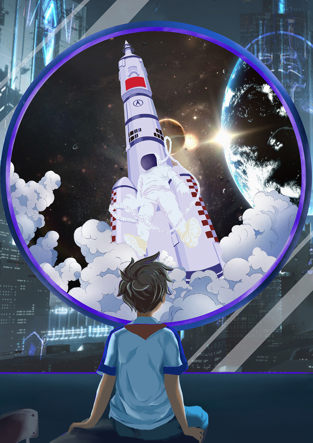 為了紀念1978年至今,中國改革開放進入第三十個年頭,經濟取得的舉世矚目之發展,中國的航空航天事業發生的翻天覆地之變化。創作的系列插畫作品《航空三十年》。回望往昔,中國航天從50年代起東方紅一號的成功發射,到如今載人航天工程和繞月探測工程的蓬勃發展,創作的三張作品,分別以鄉村中的老人、戍守邊疆的青壯年士兵、城市中的孩童這三種視角,帶領觀眾遙望中國的太空探索事業。三個時期,三種視角,三種身處環境,回憶與見證中國航天、中國經濟、祖國綜合國力在短短幾十年間的的巨大變化。