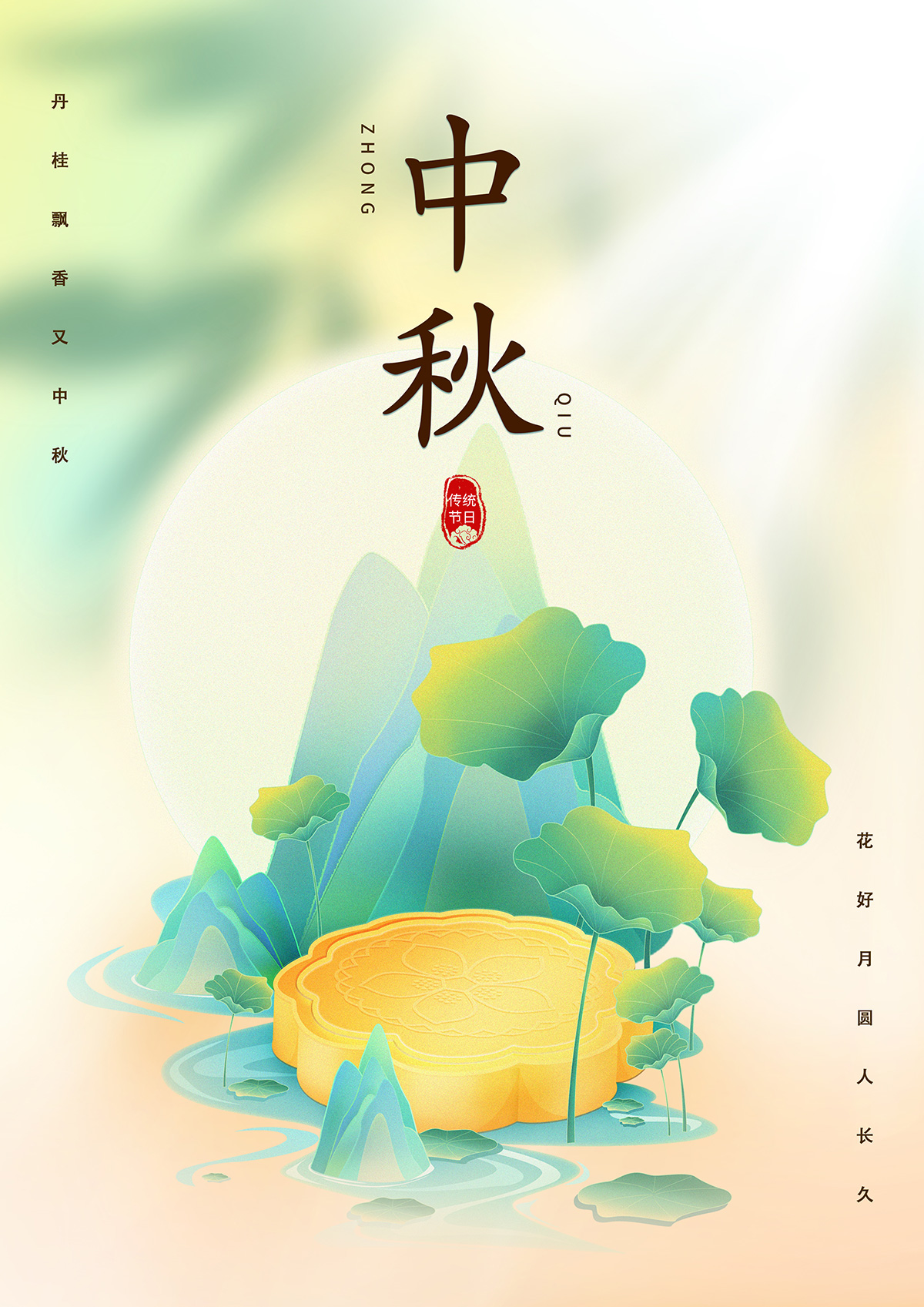 設計說明:該幅海報以中秋節為主題,融入圓月、月餅和荷葉等傳統元素,傳達節日祝福和團圓美好情感。海報采用簡約明快的設計風格,以黃綠色調為主,體現團圓歡樂的喜慶氛圍。每一個元素都有其獨特的美滿象征,同時也相互呼應,帶來一種溫馨的視覺感受。整個設計符合中秋節的旋律和特點,同時也傳遞了傳統文化的魅力和價值。