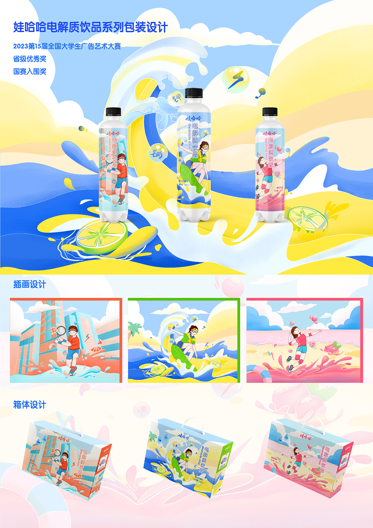 設計說明: 該系列設計以“增加活力,奮勇向前”為主題,結合沖浪、網球、沙灘排球運動場景進行娃哈哈電解制飲品系列包裝設計。以手繪插畫風格進行畫面繪制,在運動場景中融入飲品的鉀、鈉等電解質離子,使得畫面人物狀態更具活力,體現年輕人運動、健康的理念。運用動感、明快的色彩搭配,以檸檬、西柚、蔓越莓的顏色為主色調,與場景的果味以及人物動態相結合,同時契合該系列飲品補充電解制、多效補水、等滲技術補水的產品賣點,包裝整體視覺設計吸引消費者的購買。