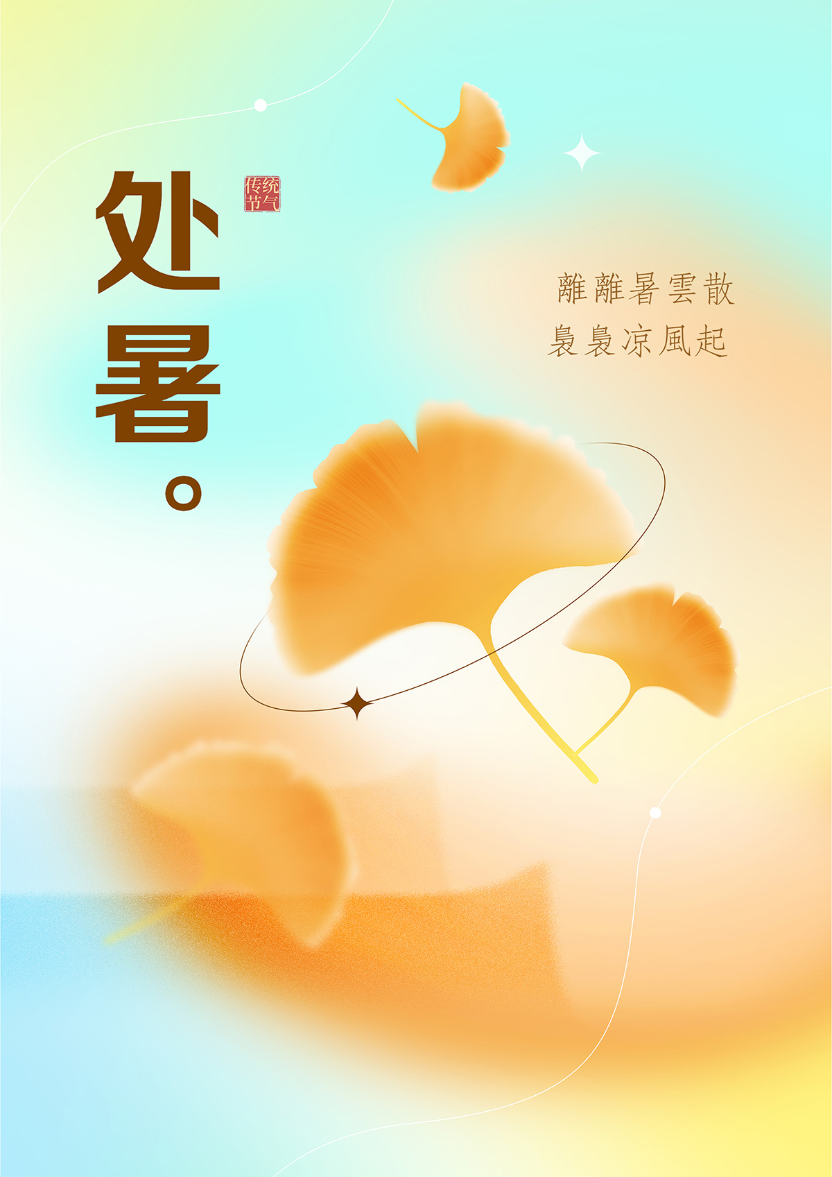 該幅海報以處暑節氣為主題,亮麗橙黃色的楓葉元素和彌散風格表現出輕盈、自然的動勢。設計中運用了點線面元素,通過點的集合和線條的勾勒,呈現出栩栩如生的楓葉形態,橙色的楓葉與天藍色的背景形成對比,凸顯了楓葉的美麗和獨特。整個設計風格簡潔明快,色彩鮮艷,給人以節氣的美好和自然的魅力。