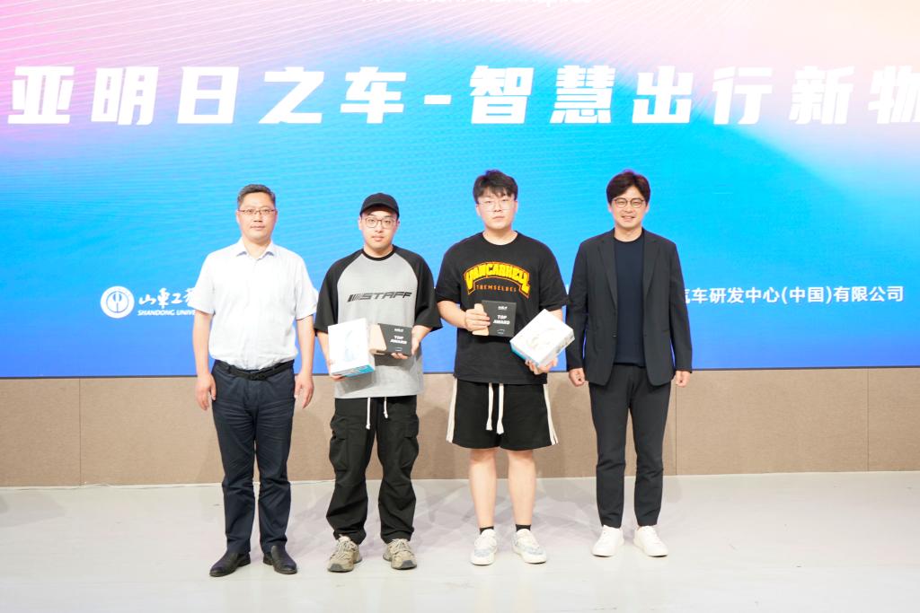山東工藝美術學院教務處處長顧群業(yè)、工業(yè)設計學院書記王玉杰、工業(yè)設計學院副院長張公明,以及韓國現(xiàn)代汽車研發(fā)中心起亞造型部室長任承模、責任研究員李孝成、外飾造型設計組組長梁立升共同為獲獎同學頒發(fā)了證書及獎品。