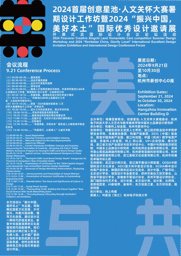 2024年9月21日,備受矚目的2024首屆創(chuàng)意星池·人文關(guān)懷大賽暑期設(shè)計工作坊暨2024“振興中國,美好本土”國際優(yōu)秀設(shè)計邀請展在杭州錢塘區(qū)盛大開幕。此次活動匯聚了國內(nèi)外眾多設(shè)計精英,順利開展了國際設(shè)計會議論壇,共同探討了設(shè)計的未來趨勢,并展示了一系列以文化創(chuàng)意與人文關(guān)懷為核心的設(shè)計作品。