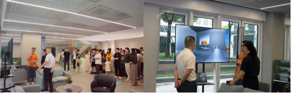 開幕之際,何老師引導(dǎo)蒞臨現(xiàn)場的領(lǐng)導(dǎo)、嘉賓及新階層人士舉行展覽巡視活動,介紹主要的展區(qū)及此次展覽實現(xiàn)的設(shè)計技術(shù)賦能文化創(chuàng)新領(lǐng)域的相關(guān)展現(xiàn)。