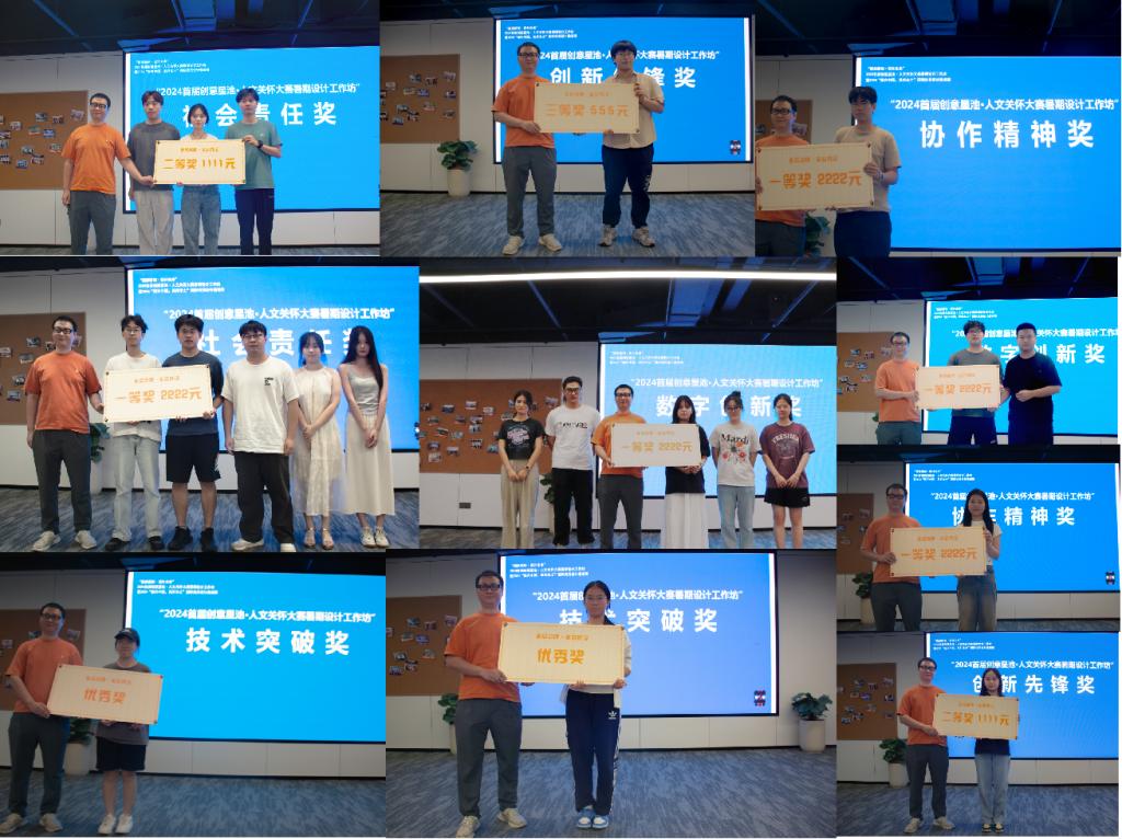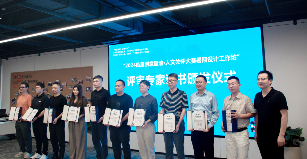 接下來進行的是“2024首屆創(chuàng)意星池·人文關(guān)懷大賽暑期設(shè)計工作坊”成果評審證書頒發(fā)環(huán)節(jié),中國本土品牌設(shè)計研究所秘書長、杭州拓邦企業(yè)服務(wù)有限公司陳林林為分別來自浙江科技大學(xué)講師,安吉縣浙科研究院研究員傅游磊、浙江傳媒學(xué)院教授、澳門大學(xué)博士楊超以及浙江師范大學(xué)動畫系教師,韓國成均館大學(xué)設(shè)計學(xué)博士陳滌塵等十余位評委頒發(fā)證書。