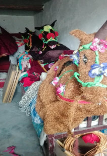 胡街:首先是這幾種民俗表演藝術(shù)的繼承問題,讓我們很是擔(dān)憂啊。我們團(tuán)里,年齡最小的是五十歲,年齡最大的是八十歲,目前為止,我們還未找到能繼承下去的人。本來我們團(tuán)里還有踩高蹺藝術(shù)表演,道具我都做好了,只是不敢再往外拿,畢竟團(tuán)里人年齡大了,禁不住折騰。其次還是關(guān)于資金問題,我們沒有任何國家補(bǔ)助,一切費(fèi)用都由我們自己出。這幾年我們已經(jīng)很少參加比賽了,大部分竹馬已經(jīng)老化,一是用的時間長了,二是沒很好的儲存空間(小編跟隨團(tuán)長進(jìn)入儲存室拍攝,所謂的儲存室就是類似于一個放雜物的小倉庫,空間小,竹馬和花船以及一些獎牌很擁擠的被堆放在一起)。希望像竹馬這種民俗藝術(shù)能被足夠的重視起來,繼而傳承下去。