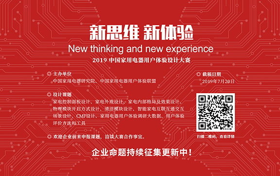 “中國家用電器用戶體驗設計大賽”作為2019年中國家用電器用戶體驗高峰論壇的配套活動,將于3月率先啟動,大賽經由定制主題、媒體傳播、作品的評審與宣傳,最終結果將于用戶體驗高峰論壇上公布。