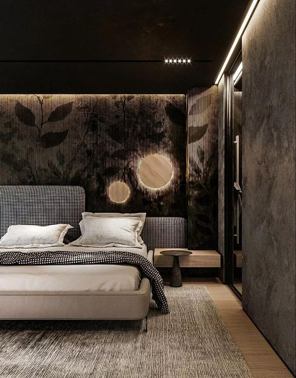 主臥空間中使用簡約內(nèi)斂的高級黑作為主色調(diào)使人沉淀心靈, 淡淡的原木色系是貫穿空間的靈魂,配以舒適溫柔的床品,藝術(shù)壁紙的穿插、融合打破了空間的平淡乏味,每一處都彰顯著居住者優(yōu)雅的生活狀態(tài)與情調(diào)。
