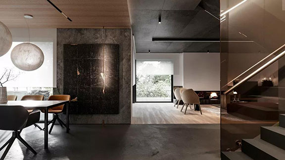客餐廳空間基調(diào)為中性灰色,餐廳兩個皓月般的圓形吊燈 是對極簡設(shè)計的一種溫柔回應(yīng)。它復(fù)古溫婉,盡顯極簡主義,呈現(xiàn)出簡約、休閑的都市格調(diào)。