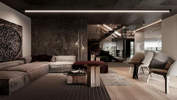 為了保持簡練潔凈的質(zhì)感,客廳利用柔光筒燈與一根簡潔的燈管為照明帶來更多層次,也中和了黑色天花板帶來的冰冷,讓每一束光為家?guī)韯e樣氣質(zhì)。