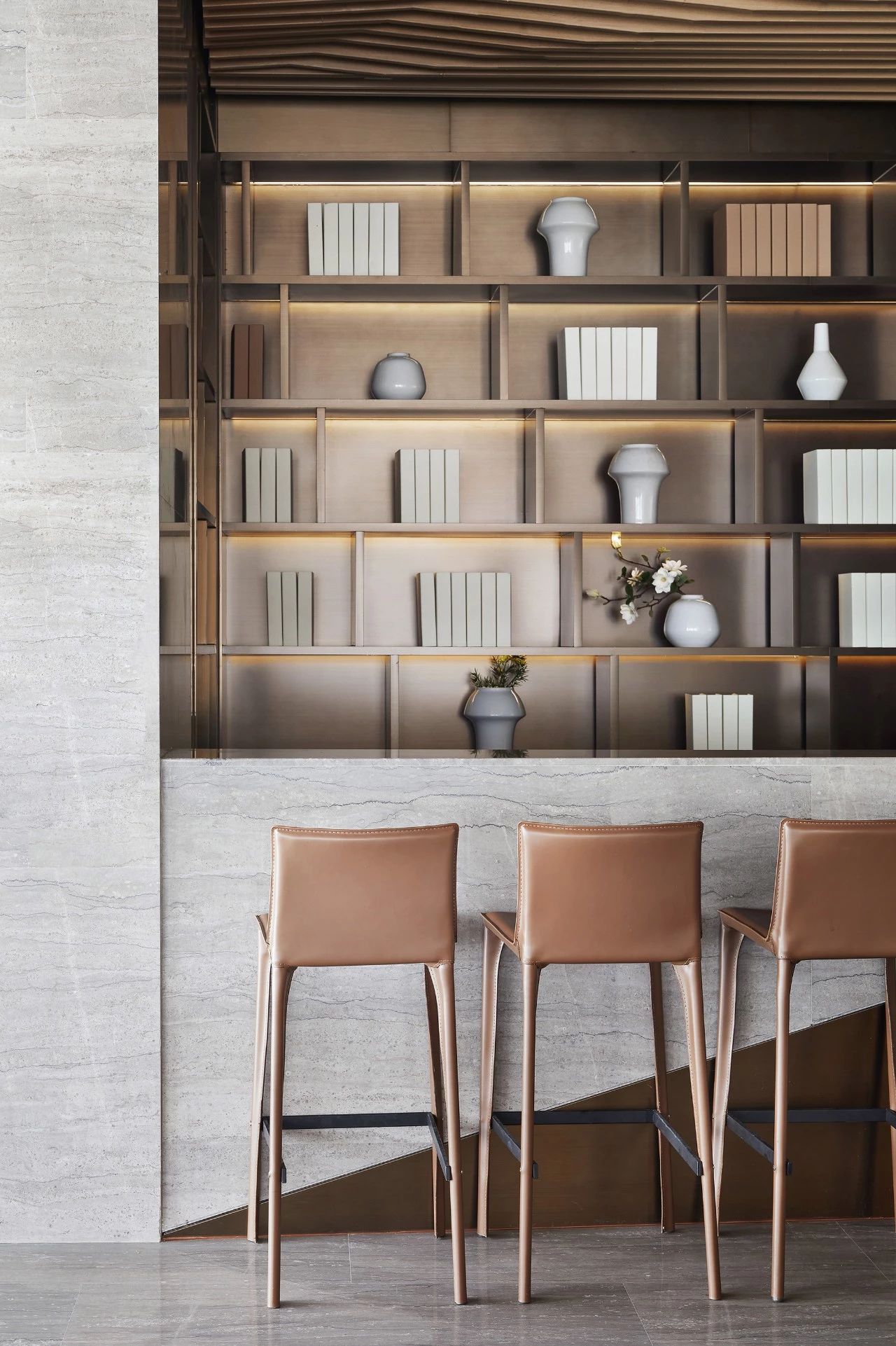 空間布局上先藏后露,隨之徐徐行進,感受幾何塊面帶來的閉合與通透等變化,以及視野延伸下的物我狀態。行至轉角處,借助墻體前后塊面的錯落,大理石與木藝拼接出一個清靜端雅的水吧空間,起承轉合的雅棕與玄灰主調,涵容書架上瓷器、花藝、卷帙的比例,構圖上呈現一種清新澄凈的藝術感。恍若千年時光留痕于此,一樹梨花光影呈畫,盞茶致知音,清氣縈繞久。