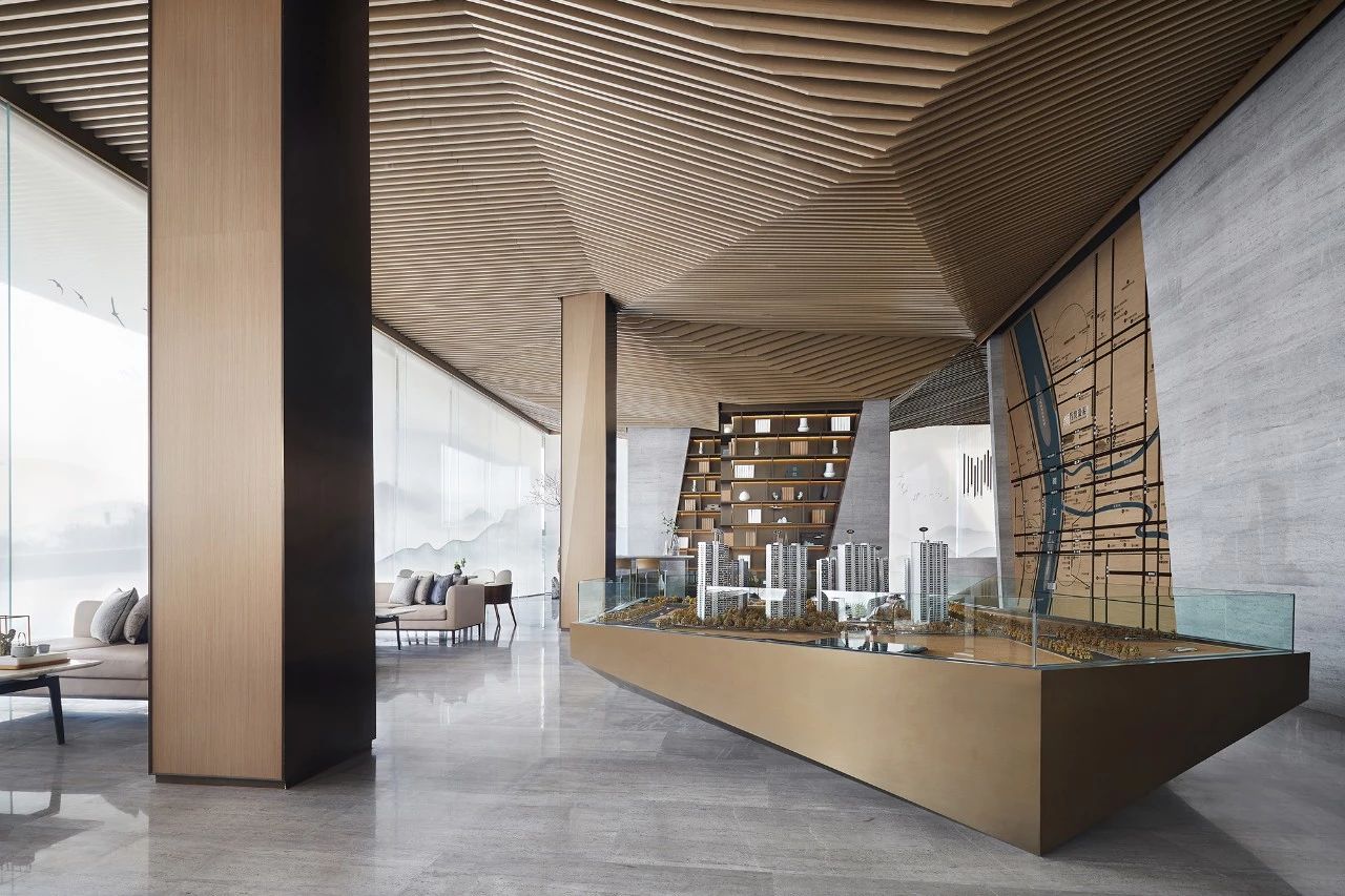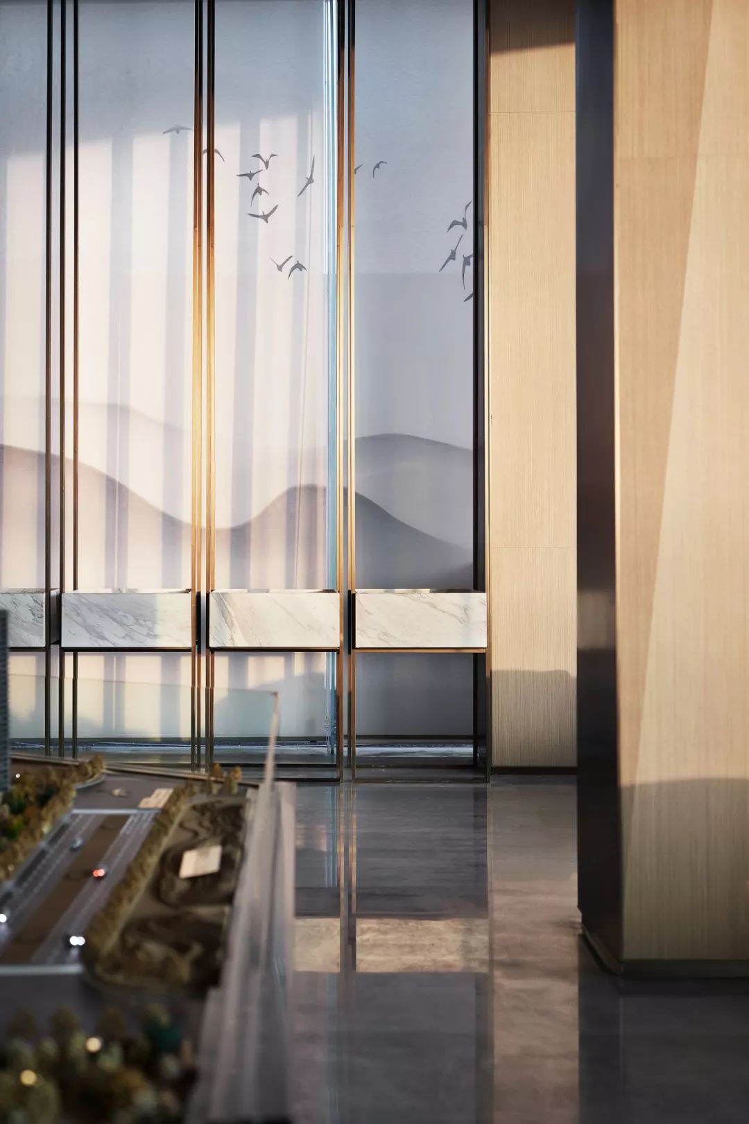 步入空間,平沙落雁之景描于水墨畫卷上,三五成群的大雁,空際盤旋,倏隱倏顯,定格其間雅致素凈的玄灰主調,近相呼應室外山水景觀意境。設計師從棱角分明的霧凇切割面獲取靈感,以幾何立面體塊的形式重構了接待臺與背景墻,融注進當代藝術的氣息,在視覺變幻中,展呈美學萬象的不同截面。