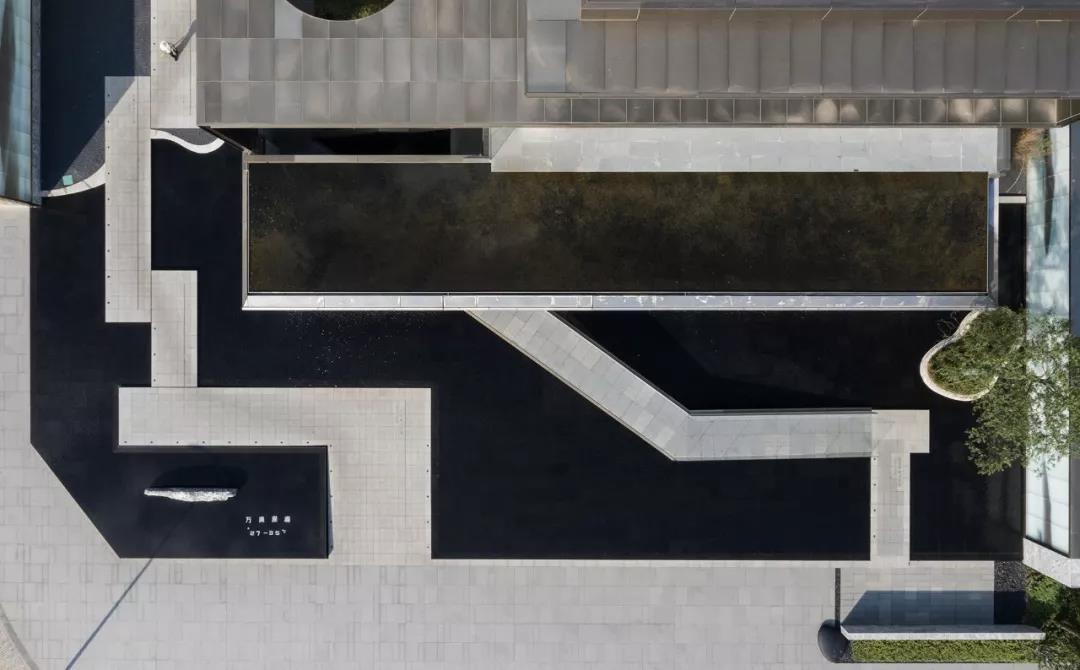 水景的回環動線以建筑為圓心視點,經由石階周折引入,設計所要傳遞的東方隱逸層層遞進,曲徑縱深,流水潺潺。于方圓之間,造物,造景,亦造境。檐側落雨簾,大珠小珠渾然歸一,又周而往復,激起點點漣漪,回旋在空濛的意境之中。