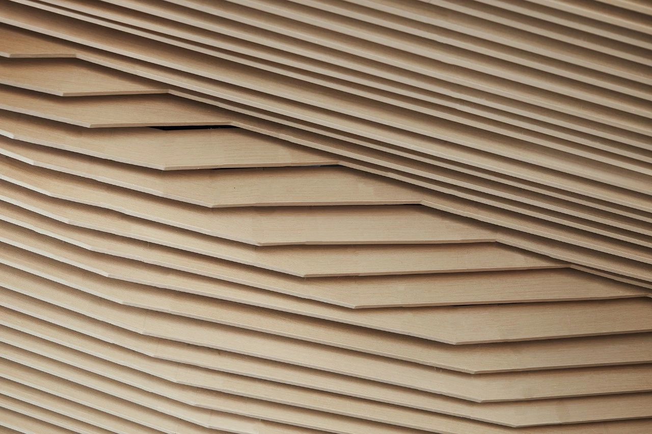 沙盤區軒然朗闊,幾何塊狀的疊加,運用于沙盤底座,延續了端秀而雅正的秩序感,與層次分明、疏密有致的木藝天花相映成趣,銜接起峰巒百轉、嵐煙迂濛的畫意詩情,于溫煦淡雅的氛圍中,一探空間的境中深蘊。