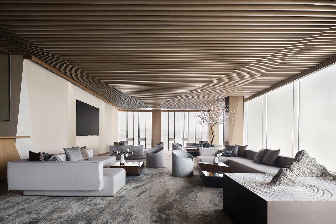 庭者,堂前階也;院者,周坦也。建山水,植松竹,依軸為序歸置山水動線。長幅潑墨山水畫卷圍合起建筑與堂前朗闊之地,山石水景各有逸趣,又富于形、歸于道,重置當代語境下的東方文化認同感。云紋墻面上雕鏤的半透屏風圓融雅正,以金屬穿孔板為材,在漏景中定格流云紋樣,勾勒出輕靈入勝的美學意涵。