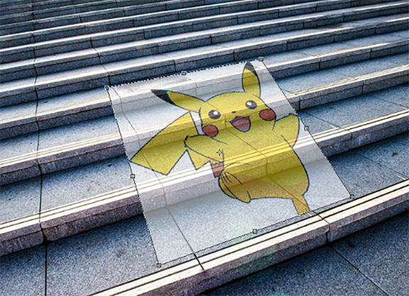 然后Ctrl+T按住ctrl鍵不松開,去拖拽錨點(diǎn),將比卡丘和階梯的方向調(diào)整一致,如圖所示: