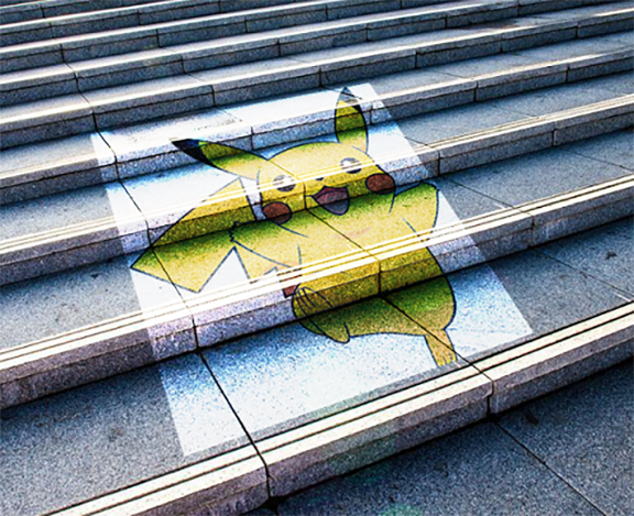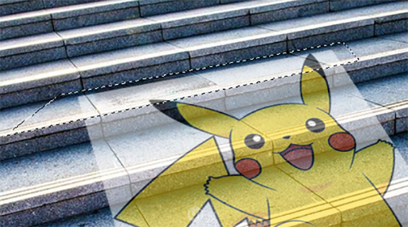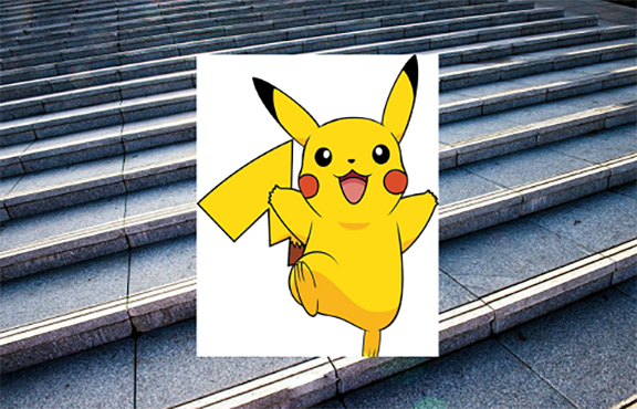 首先,我們把兩張素材圖放進(jìn)PS里,比卡丘在上面,階梯圖在下面