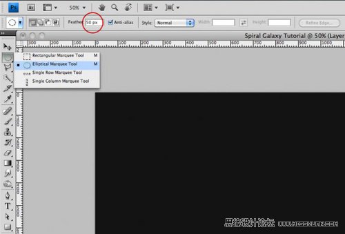 從PhotoShop左邊常用菜單中選擇橢圓選框工具,并設置羽化為50像素。見圖四: