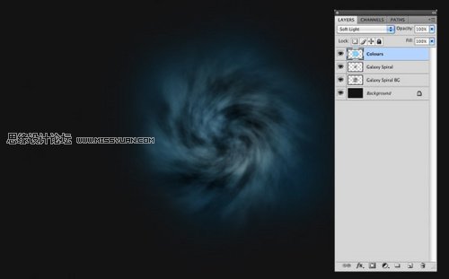 在頂部創建一個新層,設置其混合模式為柔光。使用一個大的,硬度設置為0的圓形筆刷為星系添加一些顏色。使用橡皮擦可擦除星系以外的顏色。見圖十一: