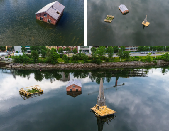 一座教堂與兩座房屋組成的小村莊半截身子淹沒在水中,盡管建筑毫無損壞,但這座“村莊”顯然早已失去了生命氣息。魁北克本地的多媒體藝術家團體 Théatre Rude Ingénierie 創作了這件《水位上升》,如果全球變暖更加嚴重,我們的家園都會變成這個水中的“村莊”。