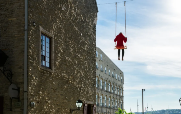 美國街頭藝術家 Mark Jenkins 的《無題》在魁北克好幾個地方都悄然出現,他制作了一系列真人大小的人物雕塑,在城市各處做著離奇的舉動,比如在空中無保護措施地蕩秋千,或坐在墻頭。