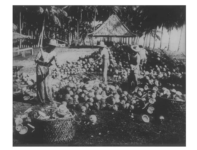 椰子棕櫚(Cor MEIF,Am)是野生的,后來被所有熱帶國家的種植,但從未遠離海岸。對太平洋許多島嶼的當地人來說,它是最重要的植物,它提供食物、飲料、住所、燃料和大量有用的物品。生堅果的肉很有營養,椰奶也很有營養,這些都是本地飲食的顯著特征。許多當地人非常喜歡從他們收集的果汁中發酵出來的酒精酒,這種酒是通過切割終端芽來收集的。椰樹的木頭可以生火,也可以當做建房屋的框架。椰樹的葉子,常被用來蓋當地的屋頂。堅果外殼的纖維可以扭曲成繩索和繩子,硬殼可以當作碗或杯子。從熟透的堅果干肉中,榨出的油可用于烹飪,也可以點燈。當地人將大量用于飲用的椰子肉賣給貿易商,以換取布林、五金和其他物美價廉的商品。在菲律賓群島拍攝的這張照片顯示,幾個當地人正在清理大量的椰子樹,準備烘干椰子。這些堅果,是幾個星期前從附近的椰子樹林中收獲的。這些樹在背景中表現得很好。像往常一樣,它們的生活就在這個海岸邊上。一個帶著新鮮椰果的人回到我們身邊,他正試圖把果殼撕開。另外三名男子用“大刀”或“砍刀”,猛擊堅硬的椰果,碎堅果被扔在竹子或藤條編成的大籃子里。然后,它們在陽光下的曬干架上散開,幾天后堅果的肉就會枯萎,可以很容易地從殼里分離出來。大殼被挑出來扔了,肉就被完全弄干了。椰子油是從歐洲和美洲的椰子中榨出來的,用于制作肥皂、蠟燭和烹飪。