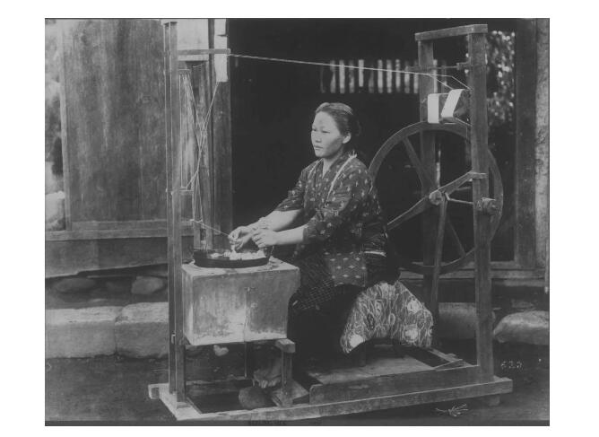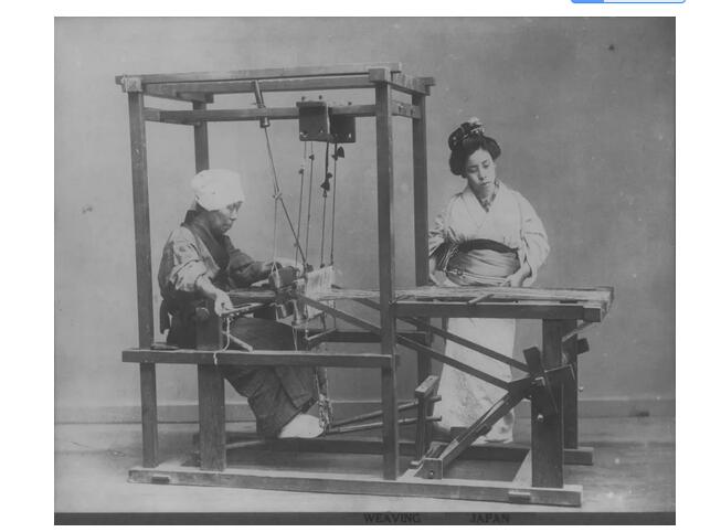 這張照片中的織機是日本最常用的手足織機之一,世界各地都使用類似的織機。這位年長的婦女正在織絲綢,她右手拿著一個梭子,腳踩著腳踏板。在這種織機中,踏板是由竹子制成的,控制經紗或織物的縱向線。經紗在橫梁上小心地纏繞著,從織機的右端可以看到。這條橫梁把經紗拉緊,用一根釘把橫梁的一端固定在十字架的一只手臂上,防止它轉動。這個十字架和它的掛鉤在畫中清楚地顯示出來。從經紗橫梁中,螺紋向上穿過長桌,就是織機的盡頭。在這里,有分開和交叉的兩個拉鏈桿,它們由年輕的婦女控制。從皮帶桿上,經紗穿過卷軸,這些紗線被布置在小框架上,并由機器頂部的滑輪上的兩根繩吊起,兩根絞盤中的每一根都被布置成連接經紗的交替螺紋。因此,當一個踏板上升,另一個降低時,經紗的交替螺紋被抬高,穿梭機通過兩組經紗之間,然后踏板被逆轉。她拋出了下面的經線,拉下了上面的經線,然后穿梭機又在兩組經紗之間通過了。在穿梭之后,織工左手所持的扣被拉向操作者,就把緯線緊緊地拉到先前織好的布上,然后再把扣向前推,腳踩踏板上下換扣后扔梭子,一直反復做這個動作……當織布被編織時,扣板又被拉向織布機,它不時地卷在布梁上,它的圓形末端可以在織工的右手附近看到。這個織機的建造方案和現代動力織機的計劃沒有本質的區別,就像世界上幾乎所有地區的工廠,都有這樣的織機一樣。這種織機編織著平常的織物,條紋布可以通過調整不同顏色的經紗獲得,格子布則可以通過改變緯和經紗中使用的線的顏色來編織。若想織更復雜的花紋,則需要更復雜的織機。在一家現代化的紡織廠里,經常有幾百臺電動織機同時運行,所有的工作都是自動完成的,只需要工人供給紗線,理順纏線,連接斷裂處,調節機器。