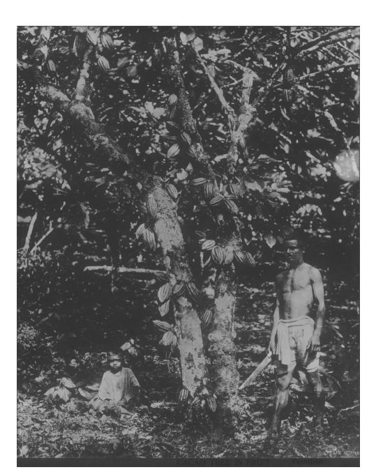 可可樹(Theobroma Ara,Sofia a)原產于南美洲西北部,它還生長在錫蘭、毛里求斯和其他島嶼的印度洋,爪哇和其他地區的東印度群島,波多黎各、夏威夷和菲律賓。可可樹相當小,很少超過二十英尺高,通常生長在大樹的樹蔭下,葉子、花朵和果實在一年中的任何季節都有。在西印度群島每年可收兩次,一次在六月,另一次在十二月。果實在樹干上和更大的樹枝上結出,成熟時長六到十英寸,呈黃色或紫色。每顆含有50至75個種子或可可豆,包在粉白色的可食用果肉中。這張照片攝于特立尼達島,展示了兩棵可可樹的樹干和枝條。結果很明顯,它們的莖直接從樹枝和樹干上長出來,有些甚至在樹根附近生長。圖中的工人和孩子是來自印度的苦力。成千上萬的這些人從印度來到特立尼達和牙買加,在種植園工作。他們通常是被帶過來的,合同期限為幾年,他們中的大多數人回家后手里拿著一把砍刀。在大多數炎熱的國家,這些大刀是很常見的工具。西印度群島的工人們用它們砍甘蔗和香蕉、雜草,有時甚至砍掉小樹。當西班牙人征服墨西哥時,他們發現阿茲特克人用可可豆制作了一種名為“巧克力”的飲料,這種飲料以其令人愉悅的風味和香氣,以及非凡的刺激性和滋養性,立刻在入侵者中得到了高度的青睞。它是由Cortez引入西班牙的,在大約一百年內在歐洲得到了普遍的青睞。茶和咖啡直到后來才傳入歐洲。阿茲特克人非常重視這些豆子,以至于蒙特祖馬皇帝有一個巨大的儲藏室,而且它們通常被當作貨幣用。這一習俗在危地馬拉內陸的某些印第安部落中仍然盛行,在那里可可豆是共同的貨幣。這棵樹的科學名稱Theobroma,意思是神的食物。在流行的和商業的語言中必須小心,以免混淆名稱相似的幾篇文章。可可樹的種子通常被稱為可可豆,這棵樹被稱為可可樹,可可和巧克力就是從這些種子中提煉出來的。