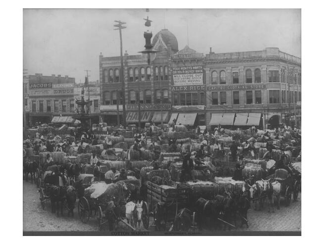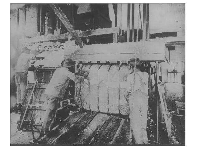 棉花從植物中采摘后,纖維必須從種子中分離出來。這是用棉花杜松子酒做的。“軋棉機”不僅將纖維從種子中分離出來,還可以將棉花打包。美國南部各州生產著世界上一半以上的棉花,這張照片展示了阿拉巴馬州蒙哥馬任市的一個公共交易場所,那里的農民帶著一捆捆棉花來賣。他們都在自己的農場里種植棉花,然后把種子摘掉,把棉花打成捆子,來這里進行交易。在美國南方,把棉花帶到最近的城鎮去賣是一種普遍的習俗。人們可以看到,這幅畫面中,幾乎所有的人都是黑人。阿拉巴馬州有很多的黑人。照片中看到的幾個白人,在馬車中行走,他們可能是買家。每個人都帶著一把鋒利的刀,用它“取樣”包。他們在套袋中大刀闊斧,掏出一把棉花,看了看,并說明了價格。農場主通常把最干凈、最上等的棉花放在外面作為樣品,買方知道這是必然的,所以洽談的過程通常只是一場鬧劇。目前南方的棉花交易,幾乎全部都在中間商手中。在其它地區,農民并不直接將棉花賣給制造商,而是賣給投機者。他們試圖在價格較低時向農民購買棉花,而在價格較高時將棉花賣給工廠。這些中間商通常也是食品雜貨商。貧窮的農民,特別是黑人,很少有人能夠自己持有棉花等待價格上漲,因為他們馬上需要錢花。因此,許多農民直接出售,而當棉花價格上漲時,中間商往往賺到大筆錢。