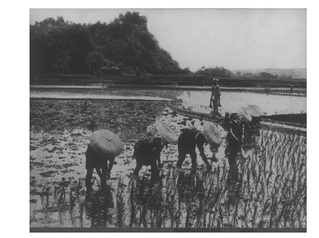 在這張照片的前景中,有幾個女人在插秧。種子首先被播撒在潮濕的育秧室里,在那里幼苗發芽生長,當有幾英寸高的時候,它們就被人抬到稻田里。在這里,幼苗被散落在稻田周圍,婦女和兒童在幾英寸深的水里插秧。在淹水的田地里,水稻生長到大約過了一半的季節,這時水會被抽走。在田野之間的水壩,既可用作道路,也可用于蓄水。豆類和其它蔬菜也會種植在這些水壩上,這樣就不會浪費空間。這幅畫中所看到的帽子,是一種只有婦女才戴的奇特的寬平形的帽子。男人和男孩經常戴著寬大的帽子,但他們的帽子是更圓錐形的。婦女的和服在她們工作時用皮帶支撐著,因此她們幾乎不能伸到膝蓋上。離開稻田時,腰帶會松開,和服會一直下降到腳踝。