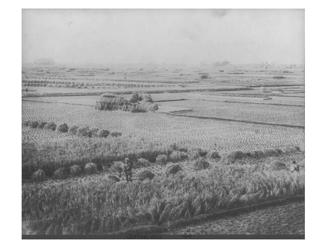 在日本,水稻是種植中最古老的谷物之一,也是東南亞居民的主要食物。禾本科植物Opsa Salma,Graimrue,是一種生長在沼澤地、長期間可以保持淹在農田中的植物,有數百個品種,有不同的顏色和許多其他的特點。不同地區的水稻株高差異很大,在許多地方它只長到大約三英尺高,就像這張圖中所看到的那樣。在南卡羅萊納州,金色大米通常有五到九英尺高,在切割時,地上留下了三英尺或更多的殘茬。在印度一些水資源豐沛的地區,水稻實際上長到超過15英尺的高度。在日本南部,廣泛種植水稻,但在北部卻很少種水稻。日本這張圖顯示了在生長季節,為蓄水而建的狹長水壩隔開的一些水稻。在收割之前,水被抽走,使土地干涸。這張照片中所顯示的田地處于低洼地帶,以至于并沒有把所有的水都排走,土壤仍然潮濕。所有的谷物都是用手割的,而不像在美國那樣用收割機割,這些稻捆被堆放在水壩和平臺上晾干。谷物是由男人或馬運回家的。在日本的鄉村地區,從來沒有見過車輛,因為沒有道路。在亞洲熱帶許多地區,大米是主食。在中國、日本和印度南部,數百萬人幾乎完全依靠它生活。它通常是被扔進沸水里煮熟的。在日本有一種叫做“莫奇”的流行的糊狀菜肴,它是由一種特別粘稠的品種叫做糯米的制成的。日本的國酒“清酒”,也是用糯米做的。