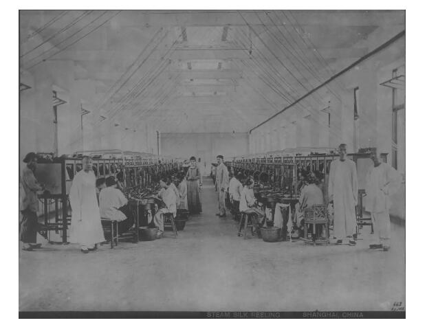 這張照片拍的是上海一家現代蒸汽絲線廠的一個房間,做這項工作的姑娘們排了四隊,每個女孩面前都是一個裝滿溫水的盆,她腳下的地板上有一個籃子,里面裝著要抽絲的蠶繭,有時多達20多個。蠶繭漂浮在溫水的表面,很快粘稠的物質就把纖維以繭的形式粘合在一起變軟,纏繞的外層絲質就可以脫落。由于它們被粘膠覆蓋而相互粘合在一起,取自幾個繭的纖維合在一條線上,穿過一系列作為導軌的玻璃珠孔,從而到達位于房間兩側的一個大盒子中的一個旋轉卷筒中。這些生絲卷筒,大量出口到歐洲和美國。當它上市時,總是扭曲并固定在一個特殊的結或漢克上。絲綢面料的制造商首先清洗生絲,將其從一些粘稠的材料中提取出來。由繭的不可卷部分(外層和內層)組成的廢絲或牙線被紡成線,就像紡棉線一樣。紡絲比拋絲便宜,被制成低檔的織物。
