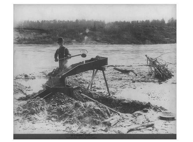 在任何國家,當發現黃金砂礦床后,投資購進昂貴的機械是必要的。但一個沒有資金的人,可以學著在平底鍋里洗礫石,淘洗那里的砂子可以獲得少量金子。即使用這樣一種原始的方式,也能賺一大筆錢。這個男子是用一個錫盆或平底鍋洗滌金子,就放在右下角處。他使用它把幾把礫石放在盆里,然后充滿小溪的水,讓砂子與澆上去的水混合,再重新灌裝幾次。不久,只有鵝卵石和沉重的金粒子被留下。他把較大的卵石挑選出去,所有的重粒子便收集在平底鍋里。
