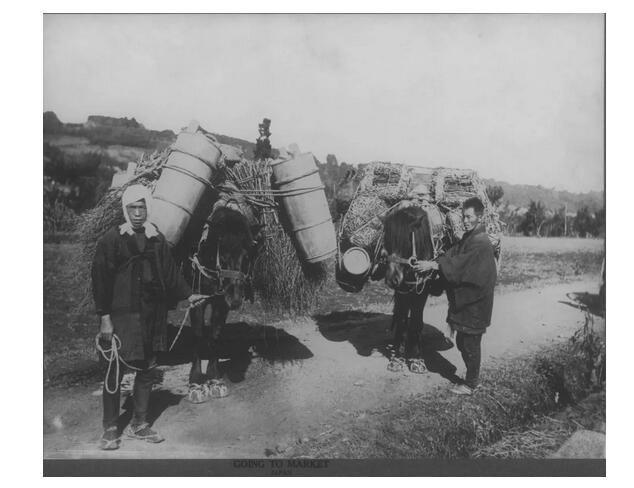 在日本市場上,稻草是稻田的重要副產品,年產量超過155萬噸,它主要當作牛和馬的飼料,還被用于制作各種物品,如制作袋子裝谷物,繩子和繩索,以及墊子、雨衣、帽子等。近年來,它被廣泛應用于草漿的生產中。草漿與其它纖維混合后,廣泛地用于印刷紙的生產。直到幾年前,日本幾乎所有用于報紙、期刊等的印刷用紙,都是從國外進口的,但目前幾乎所有的需求都是國產的。由于材料價格低廉,而且容易獲得,今后很有可能將其出口到國外。圖中說明了這種有價值的纖維的各種用途,其中固定載重的繩索、馬匹的安全帶、馬匹所穿的鞋,以及人們穿的涼鞋都是用稻草制成的。圖中還展示了日本的公共交通模式。這群馬背負著沉重的負擔,在苦力的照料下,它們被從一個地方趕到另一個地方。畫左邊的那匹馬滿載著一捆小樹枝,準備賣給人燒火。農夫很可能會在城里換肥料,然后把肥料裝在空桶里帶回家。另一匹馬馱著用稻草包裹著的木炭包——木炭是日本常見的烹飪和取暖燃料。用木炭取暖的話,通常是放在火盆里燃燒的,而不像在美國使用的是爐子。這張照片一定是在日本的一個大城市附近拍攝的,因為像這樣好的道路,足夠寬的輪式車輛,除了在城市附近是很少見的。