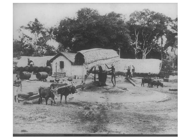 錫蘭、印度、東印度群島、太平洋島嶼和熱帶美洲是椰子最豐產的地區,這些水果很大程度上是食物的原料,干燥后大多會被搾成椰子油。堅果在樹上生長時,有一個厚厚的、堅硬的外殼覆蓋著。把熟透的堅果剝下來后,椰奶被拿出來晾干,或者在陽光下曬干,或者在火上烤干。干果被稱為“椰子”,主要出口到歐洲或美洲。這張照片是少數熱帶地區采用的榨椰子油的方法,中間是一個巨大的壓力機,工人把堅果放在里面。那塊厚重的木頭,也就是犁,碾碎了椰子,把油壓出來。中間向外延伸了一根長約幾英尺的木頭,把牛拴在那根木頭棍上,牛就像被關在密室里一樣不停地磚,油就被慢慢地擠壓出來,然后不時地被抽走。有一個鋪著椰子葉的輕型屋頂在壓力機上也跟著旋轉,它可以給壓力機和工人遮住陽光。拉壓力機的不是牛和斑馬,它是典型的印度和鄰近國家的駝峰牛。在左邊的背景中可以看到,椰子油運出的桶在這個溫度的時候是很好的,它被用于整個南亞和東南亞及鄰近的島嶼烹飪或作為照明油。在我國(指美國)它是制成肥皂的原料,加入蠟燭、齊墩果油和一些潤滑油合成后用于照明。當地人把它放在一個小的敞開式的容器中,蘸上一點棉花或其他松散扭曲的纖維,其末端延伸到邊緣,這盞燈就被點亮了,由此產生的光雖然令人眼花繚亂,但它卻是成千上萬馬來人的習慣之光。