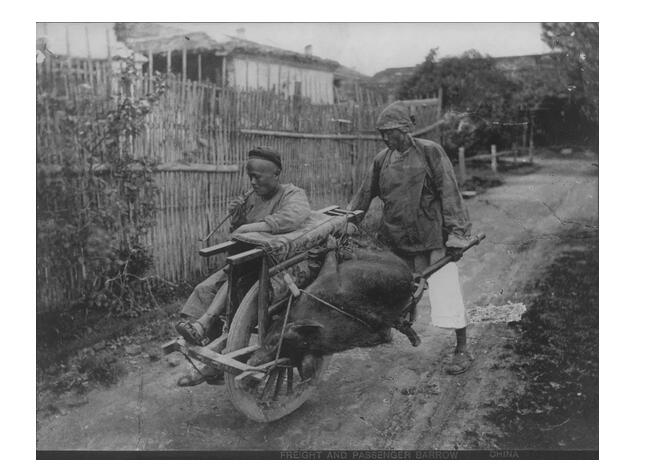 在中國這樣的國家,沒有鐵路橫穿內地,道路又窄又窮,無法使用貨車,貨運和客運就采用這種獨特的運輸方式。這張圖顯示了普通民眾的一種普通的交通方式。值得注意的是,手推車顯示,有一個如此大的車輪,貨物必須裝載在手推車的兩旁,不能放在中間,就像這輛手推車。推著手推車的人,必須把捆著車把的繩子從脖子后部繞過去支撐著它。在中國內地,幾乎沒有道路,而在城鎮之外,道路如此狹窄,以至于雙輪車輛幾乎無法通過。在美國,商品會用貨車或火車運輸,在這兒通常是男人背著。在中國,人們經常坐在綁在柱子上的椅子上旅行,這些椅子由四個人在肩膀上扛著。照片里的兩個人都穿著涼鞋,抽著煙的人,是用一個很小的黃銅碗和一個長木棍抽煙斗。