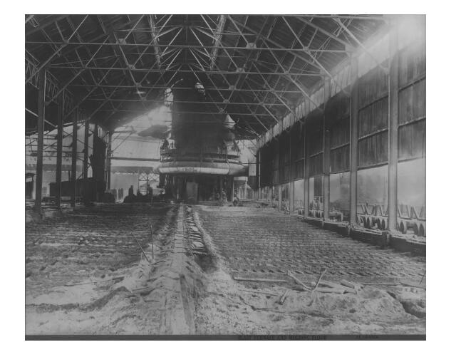 這張照片的中央是煉鐵爐的下部分,鐵礦、石灰石和燃料(焦炭或煤)已被傾倒在爐頂上方的爐頂上。加熱的空氣是由塔提供的,在爐子右側的后面,可以隱約看到其中一個塔。熱風是通過在爐子周圍運行的大型水平管泵出來的,然后從它抽進從爐子上流出的較小的管子,然后通過稱為“風口”的開口進入爐膛。這種氣流對火的影響和鐵匠用風箱發出的小爆炸一樣大。爐內產生了較高的熱量,石灰石作為熔劑,使礦石比其他地方更容易熔化。金屬鐵熔煉到爐底,新鮮礦石、石灰石和燃料又被添加到爐頂。當鐵水和爐渣在爐底聚集時,爐渣較輕,浮在鐵的頂部。爐子被敲打,爐渣從一邊流出,而金屬則被允許流過地板中間的溝槽,然后通過側面通道進入鑄鐵模具,如圖中所示。當然,當鐵水耗盡時,整個沙地會變得非常熱,工人們會穿厚厚的木底鞋來保護他們的腳。一些熔爐使用專利設備鑄鐵,有些直接將鐵水轉移到“轉換器”。在那里,它被制造成鋼鐵。大多數被煉出來的鐵,都會被澆筑到成型地板上,就像這張照片中所看到的那樣。