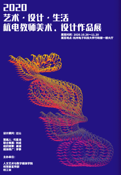 本次首屆“藝術(shù)·設(shè)計·生活”杭電教師美術(shù)、設(shè)計作品展覽旨在通過藝術(shù)設(shè)計豐富杭電師生你我的生活,通過藝術(shù)設(shè)計洗滌杭電師生你我的心靈,借助藝術(shù)設(shè)計凝結(jié)杭電師生你我的情感,展現(xiàn)杭電命運共同體的獨特面貌。海報主體紋樣“2020”靈感來自杭電著名十景中名為“長虹攬月”的校門絲網(wǎng)結(jié)構(gòu)。寓意杭電生活蕩滌鉛華、沉淀精華,聚九天玄韻,合五洋神律。于2020年多事之秋通過舉辦此次展覽祈愿歲月無恙、諸事通達,于昏暗處燈火通明,于四野間煙火燦爛,于山巔上芝麻開花節(jié)節(jié)高。