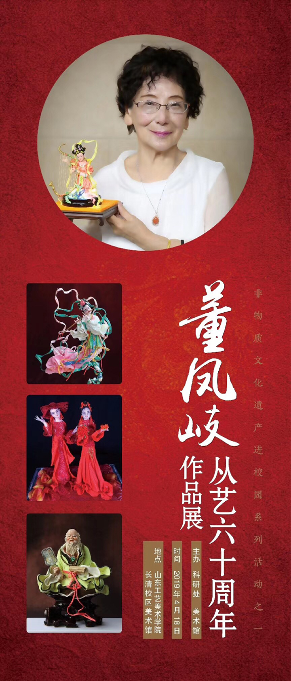 董鳳岐,1939年出生,北京人。1959年,考入中央工藝美術(shù)學(xué)院湯子博工作室,作為“面人湯”正式招收的唯一一名學(xué)生開始學(xué)習(xí)面塑藝術(shù)。1983年到山東工藝美術(shù)學(xué)院工作,并曾設(shè)立工作室,后退休于科研處。本展覽得到科研處大力支持。現(xiàn)代手工藝術(shù)學(xué)院、人文藝術(shù)學(xué)院、數(shù)字藝術(shù)與傳媒學(xué)院等學(xué)院的師生和山東大學(xué)、山東女子學(xué)院等院校的來賓參觀了展覽。濟(jì)南市文化館專門組織多位非物質(zhì)文化遺產(chǎn)傳承人代表人物參與了展覽。